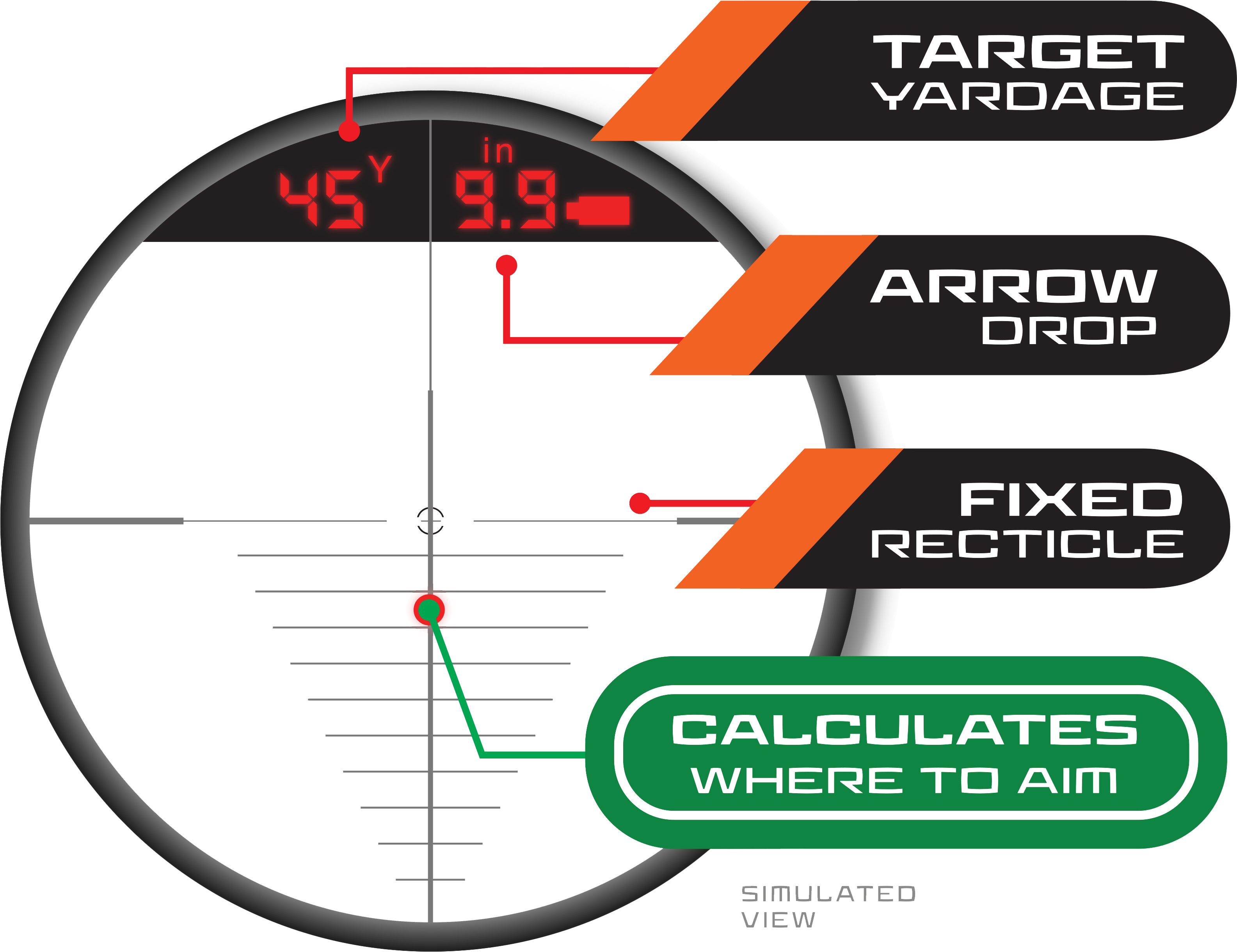 - Aiming point and arrow drop calculated out to 100 yards (Crossbow Mode Only)